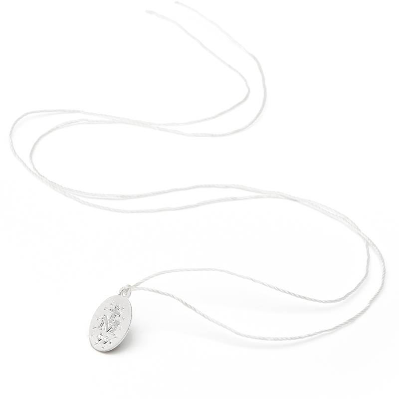 Metal | Cordão branco Medalha 1,2 x 2 cm Aprox. 34 cm de comprimento (cordão) Acompanha folheto 7 x 15 cm